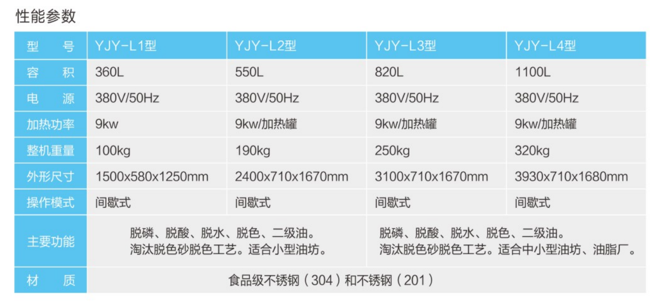 脫磷、脫酸、脫水、脫色、脫堿味、二次除渣。淘汰使用脫色砂脫色工藝。適合中小型油坊。