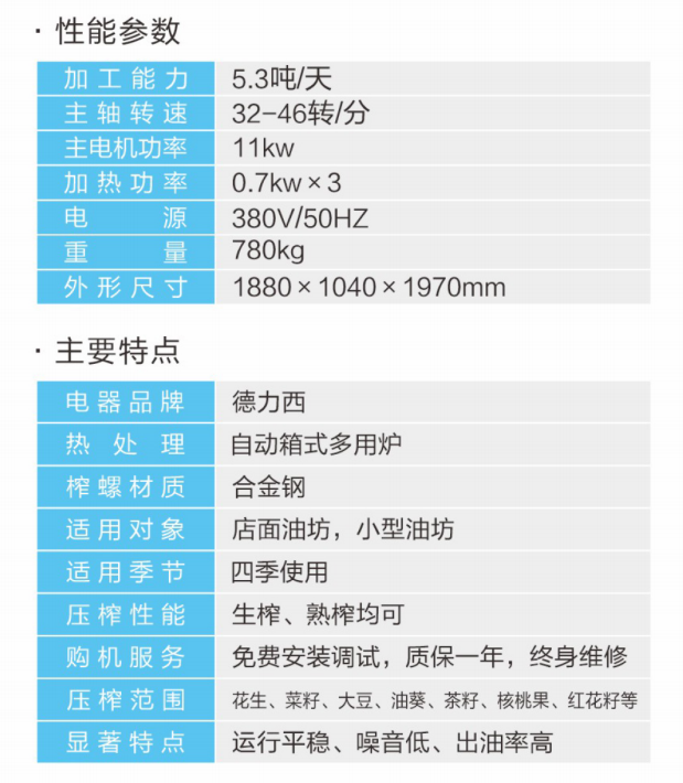 ★壓榨范圍:花生、大豆、菜籽、油葵、茶籽、芝麻等;★適用對象:店面油坊和微小油坊;★壓榨性能:熱榨一次榨盡,免費安裝調試